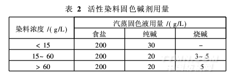 在活性染料染色中,固色液會影響顏色深淺及色光的變化。食鹽是活性染料的促染劑,堿劑是活性染料的固色劑。增加食鹽用量,可以明顯提高織物顏色深度;堿劑用量則會影響活性染料的水解和上染率,如其過量或不足均會使顏色變淺。表2總結(jié)了不同染液濃度的固色堿劑用量。