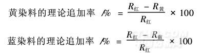 活性染料染色時,造成染料追加率不同的因素有:長車連續(xù)軋染所用活性染料的直接性和反應性,染料濃度及堿劑用量,以及軋槽染液交換速度。體積小的軋槽,染液的交換速度快,追加率應調(diào)小;反之,軋槽體積大,染液更新速度慢,追加率應相應調(diào)大。另外,織物帶液量亦會影響追加率。在設定軋余率下,粗厚織物帶液量高,軋槽內(nèi)染液更新速度快,追加率應調(diào)小;反之,稀薄織物帶液量少,軋槽內(nèi)染液更新速度慢,追加率相應調(diào)大。同時,車速快,則軋槽內(nèi)染液更新速度快,追加率就應調(diào)小;反之,則相應調(diào)大。在染色初期,拼色染料中的各染料由于直接性不同,導致其上染率也不同,小樣與大車下機差距較大,這是320軋染產(chǎn)品不符樣的主要原因。又由于320打底機軋槽體積是180打底機的1. 5~2倍,因此,活性染料的追加率是分析研究符樣率的重點。T/C產(chǎn)品采用分散/活性染色工藝時,若試樣符樣率在4級以上,定此工藝為分散/活性的軋槽用料工藝;然后,根據(jù)計算出的軋余率,調(diào)整高位槽開車工藝。開車的工藝即是追加率的制定,一般可根據(jù)滲圈來確定染料的追加率。例如活性紅、黃、藍三原色拼色時,將小樣處方染液滴在中速濾紙上,比較滲圈擴散的大小,計算出每只染料在此類處方中的理論追加率。這里選擇比移值為0. 75~0. 8的紅色染料作為基準,以計算理論追加率: