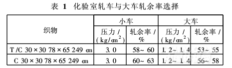 化驗室小樣軋車與大車軋車軋余率的相符性,亦是影響符樣率的關鍵因素。如果兩者軋余率相差較大,會導致染料上染率不同?;炇倚≤堒囉捎谲囁俾?軋輥線速度低于大車,軋輥對布的作用時間長,相同軋余率下帶液量少,因此小樣的軋余率需提高5% ~10%。根據(jù)320寬幅家紡軋染生產(chǎn)線的生產(chǎn)情況,摸索出化驗室小樣與大車相對應的壓力,具體工藝參數(shù)見表1。