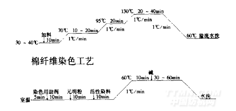 由于織物“龍纏柱”的特殊結構,僅僅通過選擇料和助劑還不能實現勻染。工藝條件上應以吸附主,高溫移染為輔來控制勻染。