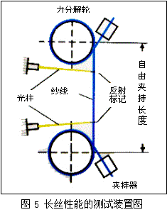 測試長絲性能的測試裝置如圖 5所示。利用光學(xué)方法記錄長絲的伸長變化來確定應(yīng)力,這里不能采用常規(guī)的機械法來做這樣的試驗,因為測試長度較短時可能會使測得的應(yīng)變值不準確,而且不能記錄每一個可能發(fā)生的斷裂。