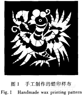 1.1 手工蠟印樣布的制作蠟印樣布制作工藝流程為:熔蠟一固定樣布一起稿一畫蠟一裂蠟一染色一固色一脫蠟一熨燙。制作手工蠟印的面料以本色棉布為主,一些高檔蠟印產品也可采用蠶絲面料,本文選用常用的平紋棉布制作蠟印樣布。所用蠟液質量配比為60%石蠟和40%蜂蠟;樣布圖案選擇具有典型民族傳統蠟印風格的裝飾紋樣,并用活性染料代替植物靛藍進行染色。得到的手工蠟印圖樣如圖1所示