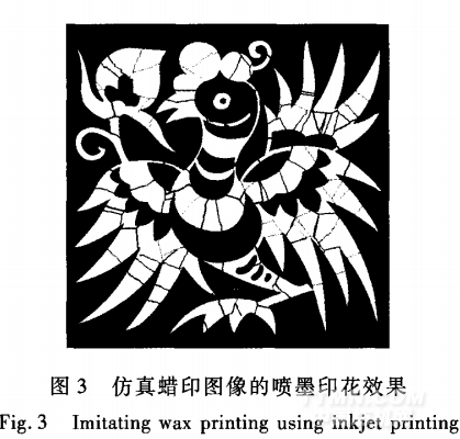印花完成后,將織物用針板固定,放入溫度為150℃的焙烘箱中烘干,烘干時間為3 min。從將圖像輸入計算機到烘干完成,整個印制過程快捷、高效、無污染,圖3為蠟印仿真圖的噴墨印花效果??梢钥闯?,蠟印圖案得到逼真的還原,冰紋的精細度高,與圖1手工蠟印樣布相比,具有較高的仿真相似度。