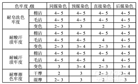 從表1可知,四種染色方法中,預媒染色和后媒染色織物的上染率較高,L*值較大,得色較深;直接染色法次之;同媒染色法的上染率最低,L*值最高,得色最淺。無論采用哪種染色方法,所測得的a*值均為負值,b*值均為正值。四種染色方法中,預媒染色織物所帶的綠光和黃光最重。其純度(C*值)大小順序為:預媒(后媒(直接(同媒。因此,采用預媒法染色可獲得較好的顏色鮮艷度。