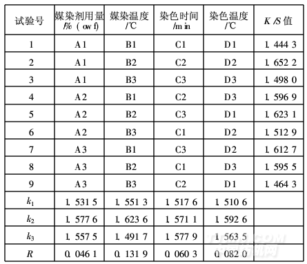 由表4中的極差分析可知,影響染色織物表觀顏色深度K/S值的順序依次為媒染溫度(B)>染色溫度(D)>染色時間(C)>媒染劑用量(A);其優化組合為: