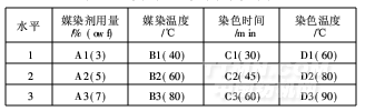 綜合以上單因素試驗,選取媒染劑用量、媒染溫度、染色時間和染色溫度四個因素進行正交試驗。因素水平設計和染色試驗結果見表3和表4。