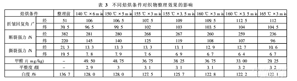 樹脂整理劑與纖維素纖維能否充分交聯(lián),焙烘條件是一個(gè)關(guān)鍵因素。溫度高,焙烘充分,平整度高,但會(huì)引起變色,造成強(qiáng)力下降嚴(yán)重。選取不同的焙烘溫度和時(shí)間對(duì)織物進(jìn)行樹脂整理,結(jié)果見表3。