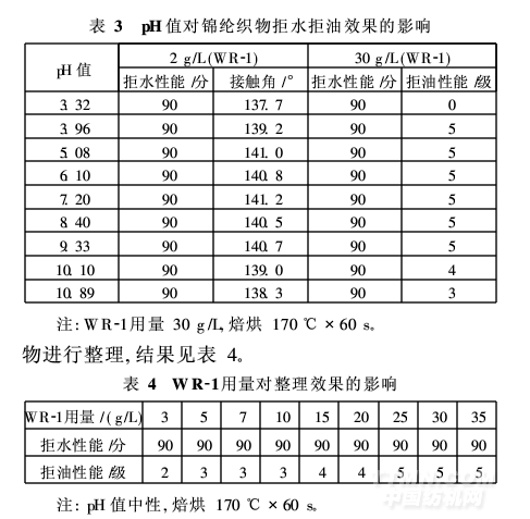 由表3可知, pH值的變化對錦綸拒水效果的影響不顯著,但對拒油效果的影響明顯。當pH值在3左右時,拒油效果基本沒有;當pH值大于10時,拒油效果逐漸下降。因此,WR-1工作液近中性時,拒水拒油整理效果最佳。