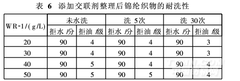 表6中,整理劑WR-1用量為40 g/L,交聯劑用量為6 g/L,標準洗滌30次后,整理織物的拒水拒油效果仍達90分和4級,可滿足客戶要求。對耐洗要求較高的客戶,建議WR-1用量在40 g/L以上。