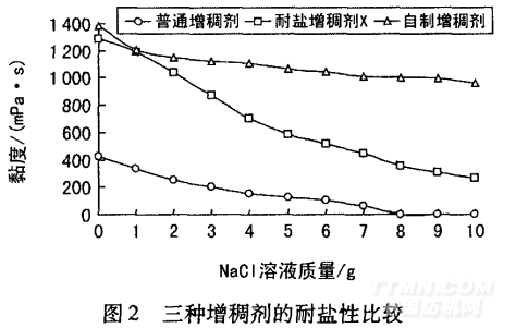 加入NaC1溶液時,由于異性電荷離子的吸引作 用,鈉離子會屏蔽合成增稠劑大分子上的羧基負(fù)離子, 從而減少大分子上負(fù)離子間的相互斥力,使得舒展的 大分子鏈發(fā)生卷曲,導(dǎo)致體系黏度下降。因此,可通過 在白漿中加入NaC1溶液來測定增稠劑的耐鹽性。將 市售普通增稠劑、耐鹽增稠劑和自制增稠劑分別配制 成1%的白漿,比較三者的耐鹽性,結(jié)果如圖2所示。