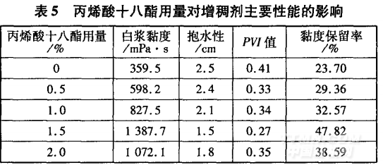 引入丙烯酸十八酯是因為其大分子鏈中含有較長 的疏水鏈段,分子內(nèi)電性斥力作用和極性基團的水化 作用使大分子鏈成伸展?fàn)顟B(tài)。當(dāng)丙烯酸十八酯濃度達(dá) 到一定的臨界點時,分子間的疏水締合作用使大分子 鏈物理交聯(lián)形成具有一定強度的空間網(wǎng)狀結(jié)構(gòu),從而 使聚合物有很大的流變性和增黏能力。改變丙烯酸十 八酯用量(單體總用量的0%、0.5%、1%、1.5%和2%),按1.3節(jié)方法分別合成增稠劑。將增稠劑配制 成l%的白漿,測定其主要性能,結(jié)果如表5所示