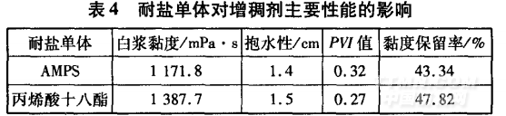 分別以2.丙烯酰胺基_2.甲基丙磺酸(AMPS)和丙 烯酸十八酯為耐鹽單體,加入到中和后的溶液中進行 共聚,再反相乳化得到增稠劑。將增稠劑配成1%白 漿,測定其主要性能,結(jié)果如表4所示。