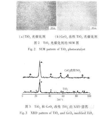 圖2 是TiO2和GeO2改性TiO2的光催化劑的電鏡掃描照片。由圖2 可見,經GeO2改性的TiO2光催化劑的粒徑較TiO2的粒徑明顯變小,分布更為均勻,比表面積會增大,催化劑中有更多的活性較高的微晶粒存在。添加GeO2后可改變催化劑的化學組成、電子結構、表面性質和晶體結構,可明顯地增強銳鈦礦復合氧化物催化劑的分散特性和吸附性能[10],使GeO2改性的TiO2光催化劑具有更高的光催化活性。