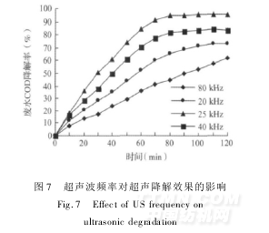 ( 3) 在一定實驗條件下,催化劑投量、廢水的pH、超聲波頻率都有一個最佳值。本實驗結果是:當催化劑用量為1. 5 ~2 g/L,pH 為2.5,采用輸出功率為1 W 和頻率為25 kHz 的超聲波照射COD為438 mg / L 的活性紅染料廢水,80 min 的COD 降解率可達95%,基本可以徹底礦化廢水中的有機物。