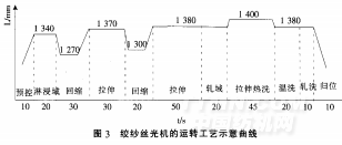 圖3是絲光機的運轉工藝曲 線。 一個絲光程序總用時約為6 min(包括上下紗)。技術參數如下: 液堿濃度:260 g/I : 液堿溫度:(23±2)cc.需配備 足夠制冷量的液相交換冷凍機以 保證整個生產過程堿液溫度穩定: 液堿滲透性:≤5 s(工業帆布 在堿液中的沉降時間).這項指標對確保絲光紗的絲光鋇值均勻一致非常重要: