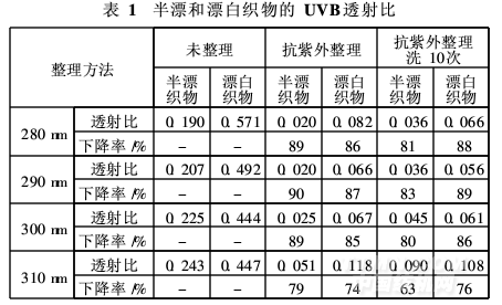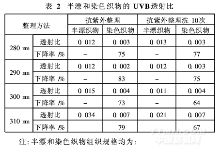 半漂和染色織物經抗紫外整理后,透射比如表所示。