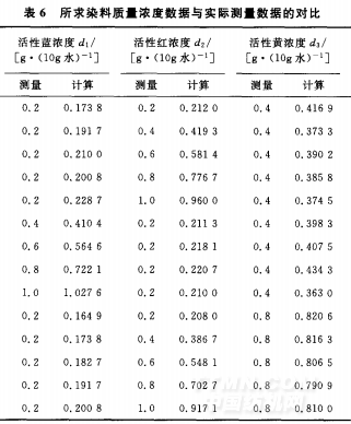 根據(jù)建立的數(shù)學(xué)模型,利用牛頓迭代法反求染料質(zhì)量濃度,并與實(shí)際測量的染料質(zhì)量濃度進(jìn)行對比,其結(jié)果見表6所示。根據(jù)表6可以看出,根據(jù)建立的數(shù)學(xué)模型求出的RGB值與實(shí)際測量的RGB值之間的誤差在誤差允許范圍之內(nèi)。說明最小誤差平均值擬合法能夠較好地解決計算機(jī)染色配色的問題。