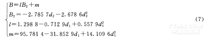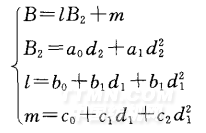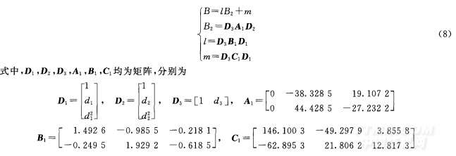 其中,a0,a1,b0,b1 ,b2 ,c0,c1 ,c2是關(guān)于d3的函數(shù),可以求出各系數(shù)與d3的線性關(guān)系式。 綜上可得,B與3種染料濃度的關(guān)系函數(shù)為