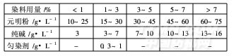 根據顏色深淺確定鹽(元明粉)用量。一般淺色10~30g/L,中色40~70g/L,深色70~100g/L,可用Na2CO3、Na3PO4調節pH值至10~11。