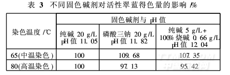 經(jīng)檢測,常用中溫型活性染料的最佳固色pH值為10. 5~11. 0(活性翠藍例外, 60℃染色其最佳pH值為12; 80℃染色最佳pH值為11)。生產中,常采用粉狀輕質純堿5~25 g/L, pH值約為11,其pH值緩沖能力很大。根據(jù)所染色澤的深淺,純堿用量5~20 g/L。用量過多,得色深度提高不明顯,反而會降低染料在鹽堿固色浴中的溶解穩(wěn)定性,降低染品質量。