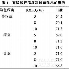 由表4可知.隨染色深度的增加.拔白漿中高錳酸鉀的濃度提高則白度相應(yīng)提高:染色深度較低時(shí).高錳酸鉀濃度提高.白度反而有所降低.這可能是高錳酸鉀相對(duì)過量.殘留的高錳酸鉀要多消耗亞硫酸氫鈉脫錳劑.導(dǎo)致脫錳不盡.引起泛黃