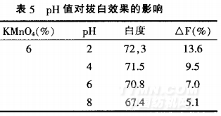 由表5可知.在酸性條件下.高錳酸鉀的氧化性較中性或微堿性條件下強(qiáng),隨DH值的降低,白度有所增大。但強(qiáng)度損傷增加更快。因此,適宜的pH為4~8.但在中性或微堿性有利于延長(zhǎng)拔白漿的適用期