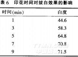 由表6可知.對(duì)牛仔坯布拔白印花后。隨晾置時(shí)間延長(zhǎng),白度提高.表明延長(zhǎng)晾置時(shí)間.有利于拔白漿的滲透.提高消色反應(yīng)程度印花時(shí)間大于7min后.白度增加趨于緩慢