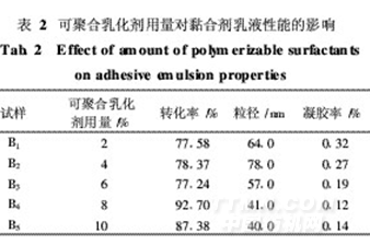 作為穩定乳液體系的主體,可聚合乳化劑的用量(對單體重)對黏合劑乳液性能有著重要影響。在單體質量分數為20%、引發劑用量為1%和聚合溫度為75℃條件下,研究可聚合乳化劑用量對黏合劑乳液性能的影響,結果見表2。
