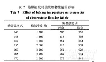 黏合劑的固化溫度是決定黏合劑膜性能的主要因素。溫度低時(shí),膜的固化不完全,導(dǎo)致膜的強(qiáng)度低;溫度高時(shí),膜能充分固化,膜的牢度增強(qiáng)。從表7可見,隨著焙烘溫度的提高,植絨織物的植絨牢度和斷裂強(qiáng)度增加。當(dāng)溫度達(dá)到160℃后,織物的植絨牢度基本不變,斷裂強(qiáng)度也變化不大,說明此時(shí)膜的固化已較完全,再升高溫度對(duì)其牢度影響不大。故確定焙烘溫度為160℃。