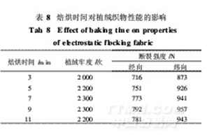 從表8可知,隨著焙烘時(shí)間的延長,植絨織物的植絨牢度和斷裂強(qiáng)度逐漸增強(qiáng),但焙烘7min后,織物的牢度和強(qiáng)度不再提高,且太長時(shí)間的高溫作用易使絨毛干澀,破壞手感,甚至黃變。故在保證牢度的前提下,確定焙烘時(shí)間為7min。