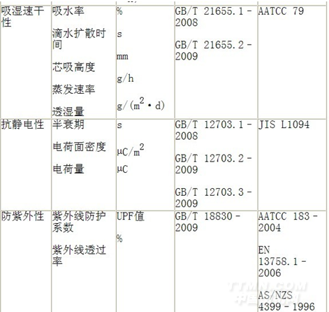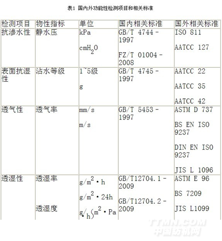 戶外運動服裝的功能性要求主要就是防風、防水和排濕透氣,其他的還包括:吸汗速干、抗靜電、防紫外、抗菌、發熱保溫等。鑒于戶外運動服裝用面料的多功能化發展的趨勢,任何一種單一的天然或化學纖維都無法同時達到這些要求,只能通過多種纖維的復合以及多種途徑化學整理來盡量使面料達到這些功能。表1歸納了國內外有關功能性的檢測項目和標準。