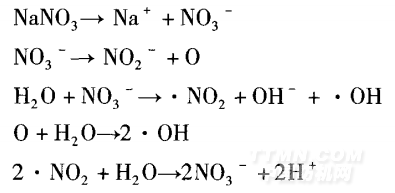 由于NO3-光解產(chǎn)生·OH,同時產(chǎn)生OH-,又因?yàn)楣獯呋磻?yīng)是在酸性條件下進(jìn)行的,OH-就會被H+所中和,促進(jìn)了NO3-光解產(chǎn)生·OH即有利于·OH的產(chǎn)生。因而硝酸鹽在一定程度上不僅對染料的光氧化反應(yīng)有作用,而且其自身還起著一個光催化氧化劑的作用。