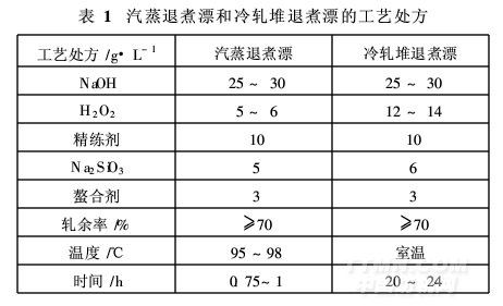 天絲纖維濕處理時具有異向溶脹性,極易產生原纖化和繩狀折皺印。退煮漂采用一步法工藝,可克服機臺多、效率低、易產生皺條、擦傷和緯斜等疵病。我們對冷軋堆退煮漂一步法工藝與汽蒸退煮漂一步法工藝進行了比較。