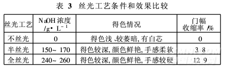 從表3可以看出,半絲光工藝和全絲光工藝得色均較深,且顏色鮮艷,但后者手感較硬,門幅收縮大,擴幅十分困難,因此我們采用半絲光工藝。
