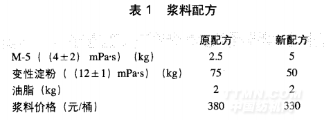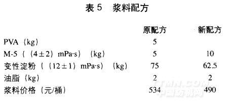 (3)洗水退漿性。牛仔布上的漿料無論在縫制前后, 都要進(jìn)行退漿(水洗)。如果在相同的上漿率的情況下,越 是容易退漿的漿料,對后道的生產(chǎn)工序越有利。 綜上所述,經(jīng)過多次的漿料選擇、配方的選擇和生產(chǎn) 試驗(yàn)、測試對比、分品種推廣等等步驟,優(yōu)化后的漿料配方 是常規(guī)的變性淀粉、M一5紡織漿料及油劑。