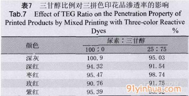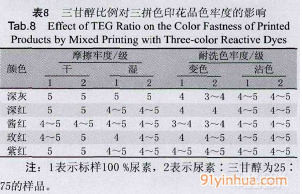 但是,在確保使用三甘醇部分替代尿素后的色深度及色差不發生明顯偏差的同時,還應確保印花織物的其他印花性能不受太多的影響。因此,將上述活性紅、活性黃和活性藍染料以任意比例混合對真絲織物進行印花,然后對印花品的滲透度、摩擦牢度和耐洗牢度等作了測試,測試結果如表7和表8所示。