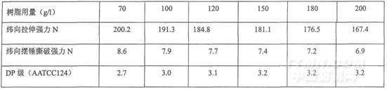 由上表可知,隨著樹脂用量的提高,DP逐漸提高,但強力逐漸下降,用量在150g/l,再提高樹脂用量,DP級不再提高,因此,樹脂用量選為150g/l左右。