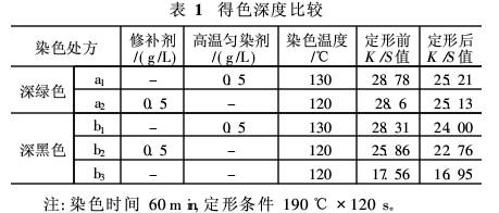 表1中, 120℃染色時加入修補劑后,染色深度可大大提高(約40% ),雖然仍較130℃為淺,但差距小于10%,因此,利用修補劑L提高高溫分散染料120℃染色時的深度是可行的。定形后深度差異縮小,這是由于分散染料升華后附于織物表面而致。