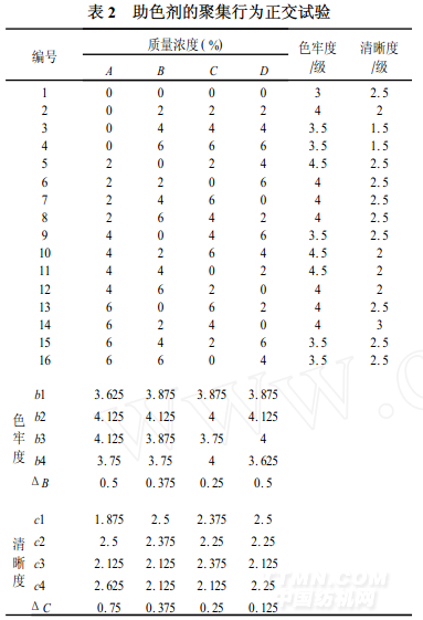 以上實驗結果表明,在端基上帶有—OH或—COOH的鏈狀物質有助于增加分散染料與羊毛纖維之間的結合力。而—OH和—COOH之間能夠產生分子間作用,形成一種聚集體。為了驗證這種聚集對助色作用的影響,進行了正交試驗。根據表1的結果,選用助色劑A、B、C、D進行正交試驗,采用4水平4因子(即L16(44))正交表。試驗方案及結果分析見表2。