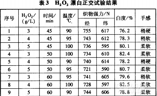 采用雙氧水對麗賽/棉交織物進行氧漂,研究雙氧水濃度、漂白溫度、時間對織物強力、白度和手感的影響(見表3),以優化氧漂工藝。