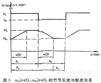 上述有關竹節長度、基紗長度計算公式可作為竹節參數設置的依據,但是它們之問的不同組合將會產生不同粗度和形態的竹節,以下分三種情況予以討論。為討論方便,不考慮伺服升降速過程,并假定竹節設置粗度不變。