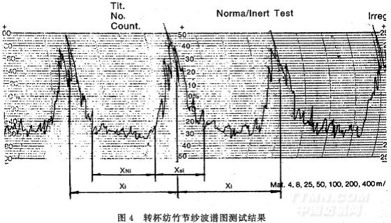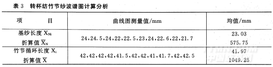 表3為上述紡紗品種與條件下,基紗設置長度840mm,竹節設置長度210mm一只竹節循環竹節紗,用烏斯特曲線圖測量法(見圖4)所測得的實際基紗長度XNi和循環長度Xi值。