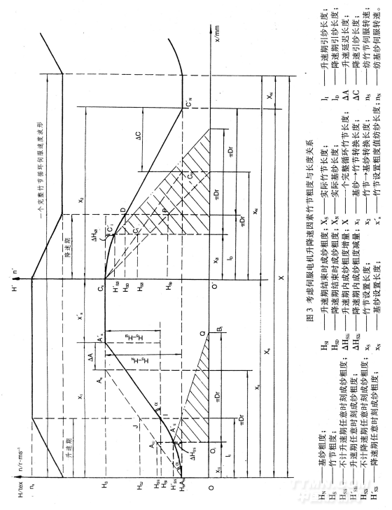 公式(25)、(26)、(27)表明,實際竹節長度是竹節設置長度、轉杯周長和伺服降速延遲長度之和;(緊接著的下一只)基紗長度為該基紗設置長度與轉杯周長和上一只竹節伺服降速延遲長度之差;一只完整的竹節循環長度是竹節長度和(緊接著的)基紗長度之和。由上述分析可知,伺服電機的升速過程不影響竹節的總長度,但它縮短了竹節粗度值紡紗長度(當xs>x1)時,并使得基紗→竹節轉換初期的竹節粗度增加變得更為平緩。伺服電機的降速過程會增加竹節的總長度和縮短下一只基紗紡紗長度,并使得竹節一基紗轉換初期竹節粗度下降趨緩,這在一定程度上補償了因伺服升速延遲使竹節粗度值紡紗長度的縮短。