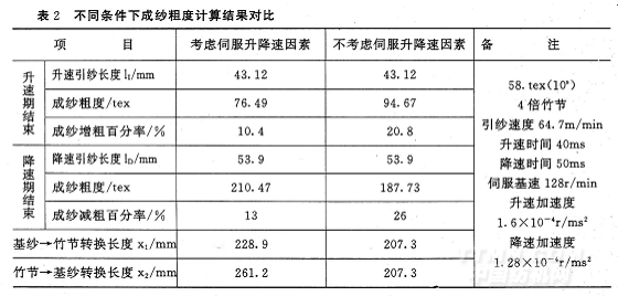 表2是根據以上推導公式,對紡58.3tex(10s)4倍竹節紗,引紗速度64.7m/min,伺服升速時間40ms,降速時間50ms時,計算得出的伺服升降速結束時成紗粗度與不考慮伺服升降速因素成紗粗度的對比結果。由表2可見,因伺服升降速因素的存在,基紗與竹節轉換初期成紗粗度變化更為平緩,其基紗與竹節轉換長度都有所延長。