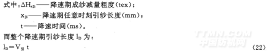 由公式(20)、(21)可知,在整個伺服降速期內竹節粗度呈兩次函數遞減變化。從D點起伺服電機降速完成進入紡基紗低速給棉。正如以上成紗原理分析所述,由于此時轉杯凝聚槽內還殘留著降速期結束時的HsD高量纖維層,要實現基紗粗度紡紗,必須待它們完全被剝離,即再經過一個轉杯周長的引紗才能徹底完成這種切換。所以,實際竹節一基紗轉換結束點延遲到C′N,而非不計伺服降速過程時的CN點。這兩點間的引紗長度即為伺服降速延遲長度AC,其值為: