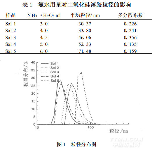 采用氨水作為催化劑制備二氧化硅溶膠,固定正硅酸四乙酯(TEOS)用量6ml 和乙醇用量100ml ,考察氨水用量對二氧化硅溶膠粒徑的影響,結(jié)果見表1和圖1。由表1和圖1可以看出,隨著氨水用量的增加,二氧化硅溶膠的平均粒徑逐漸增大,這是因為氨水濃度的增加會加速正硅酸四乙酯水解及縮合。因而,通過改變氨水的用量可以方便快捷地控制二氧化硅溶膠的粒徑。
