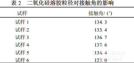 實驗發現,未經任何整理的空白滌綸試樣不具有拒水性能,測試條件下接觸角為0°;僅經二氧化硅溶膠整理后的布樣,由于二氧化硅粒子表面存在孤立、連生和雙生等不同狀態的親水性羥基,接觸角也為0°;僅浸漬水解液的滌綸織物(試樣6)與水的接觸角可達到12710°;而先經二氧化硅溶膠整理然后再浸漬水解液的滌綸布樣(試樣1~試樣5) ,接觸角均有提高,可達133°以上。這是因為經過二氧化硅溶膠整理后,滌綸織物表面的粗糙度得到了提高,再經自組裝后使拒水效果提升。該結論同Wenzel[10],Cassie和Baxter[11]等人建立的疏水表面粗糙度和接觸角之間的關系相一致。從表2中還可以看出,試樣1~試樣5與水的接觸角在13314°至13716°之間,可見粒徑分布在30~70nm的二氧化硅溶膠對整理后織物的接觸角影響不大。由于Sol4的多分散系數較小,且經其整理的織物接觸角相對大些,故后續滌綸織物拒水整理研究選用Sol 4。