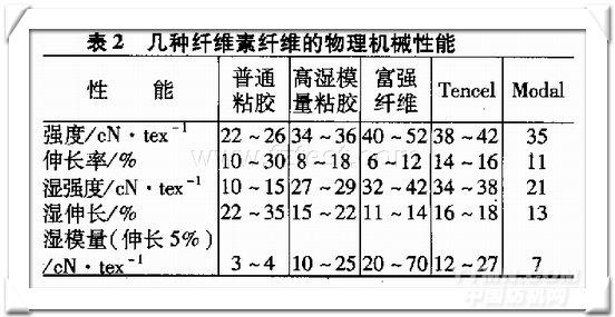 纖維結構上的差異必然會反映在性能上,表2所示是幾種再生纖維素纖維的物理機械性能。