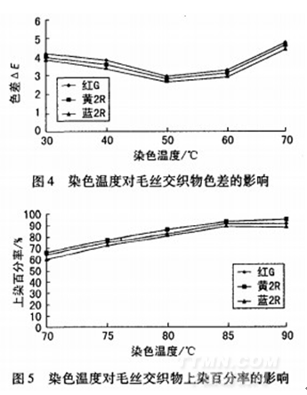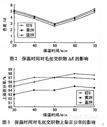 由圖2可知,隨著保溫時(shí)間的延長(zhǎng),兩種纖維色差逐漸減小;當(dāng)染色時(shí)間為50min時(shí),色差最小;之后由于真絲繼續(xù)上染,而羊毛的上染趨于平衡,使色差再次增大。由圖3可看出,保溫時(shí)間為50min時(shí),毛絲交織物的上染百分率也達(dá)到最大值。因此,染色最佳保溫時(shí)間以50min為宜。
