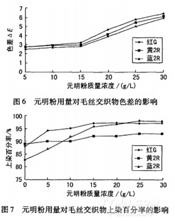 改變元明粉用量,測定其對色差值△E和上染百分率,結果見圖6和圖7。